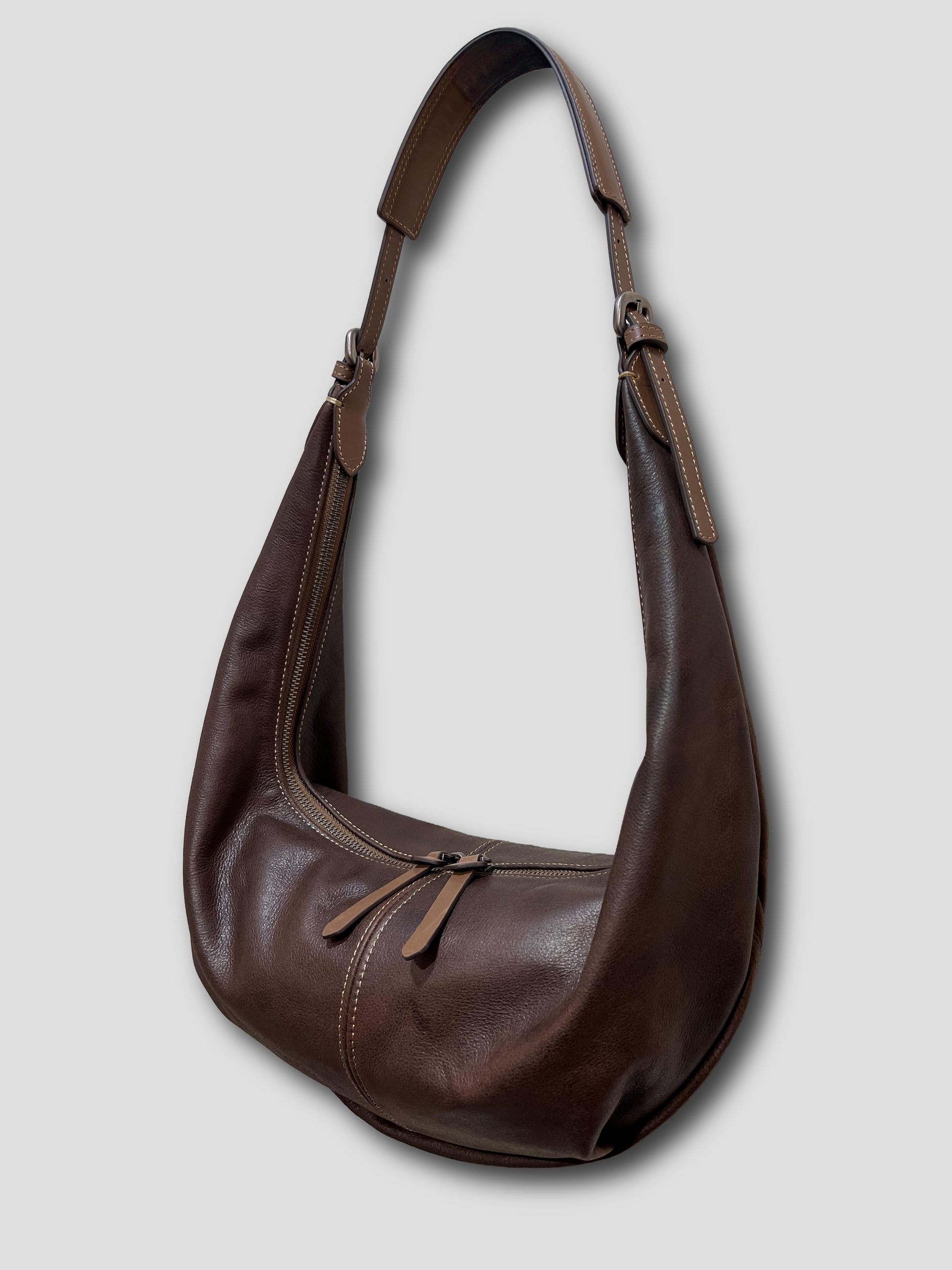 Introducing the Crescent Moon - Mocha, a perfect blend of style and functionality! Crafted from 100% imported top-grain calfskin, this lightweight bag is designed to carry your essentials effortlessly. With ample capacity and hidden compartments, it allows you to organise your long wallet, sunglasses, and thermos with ease. The additional long shoulder strap provides versatile crossbody wear. Elevate your everyday look with this stunning piece that showcases the beauty of natural leather!
