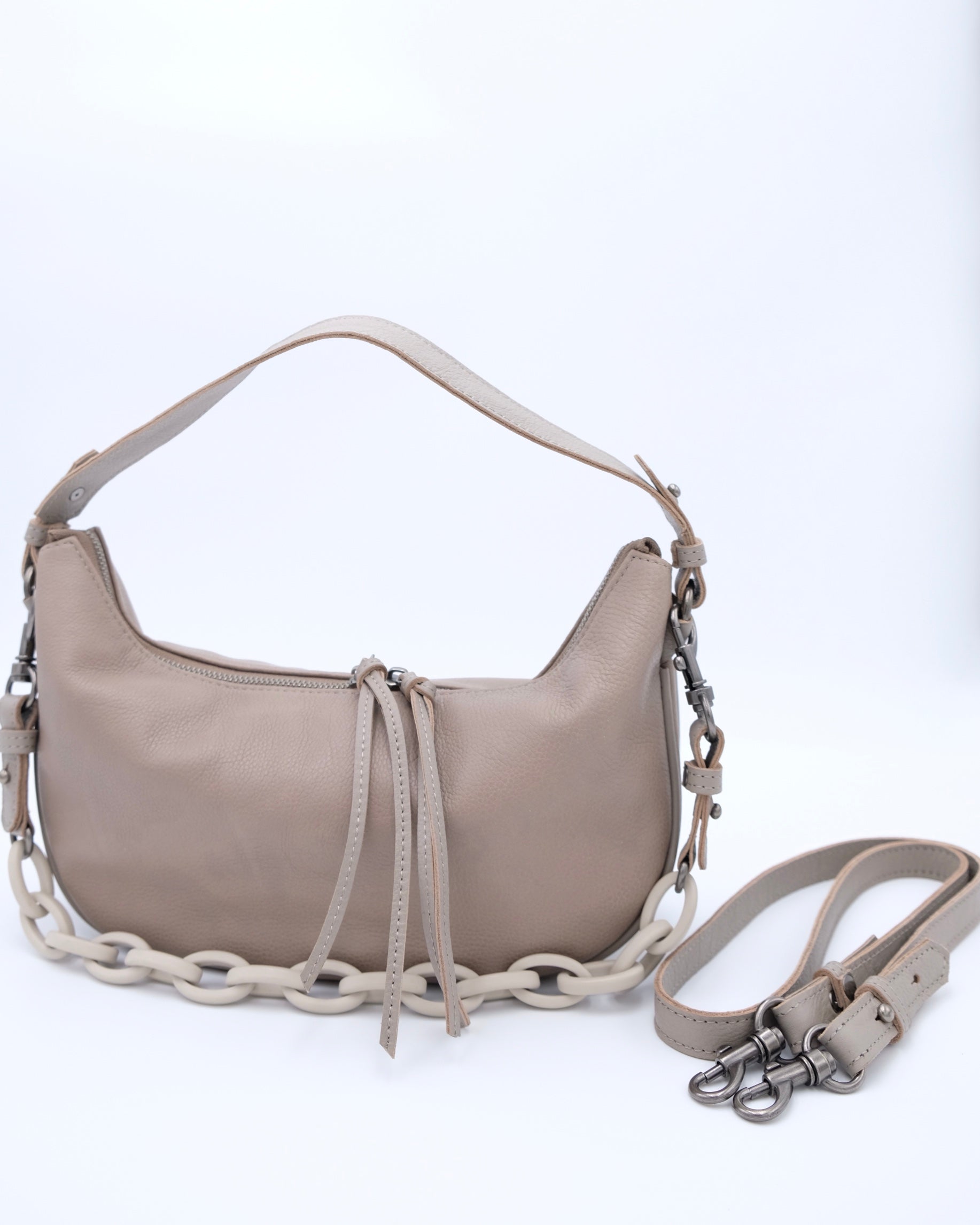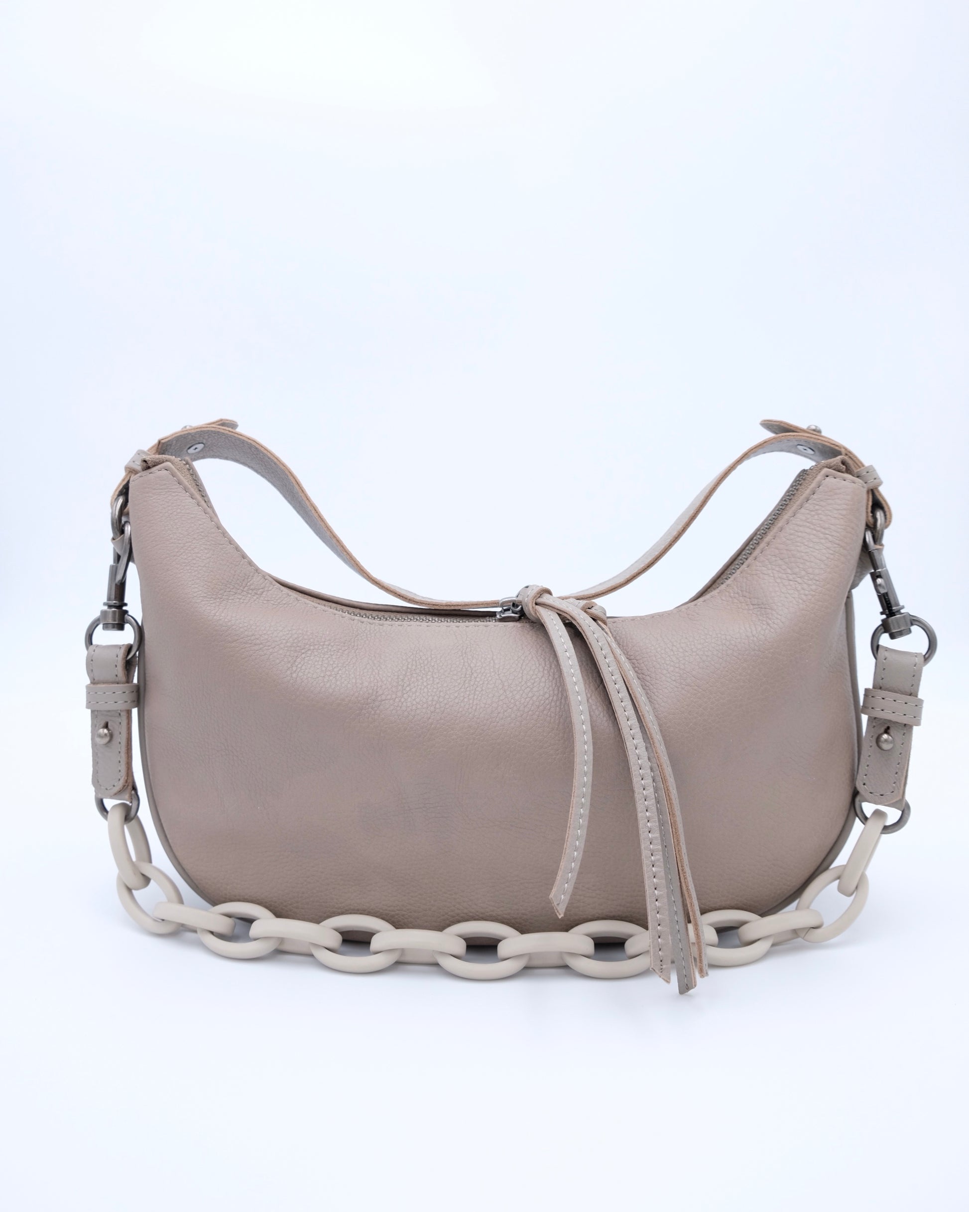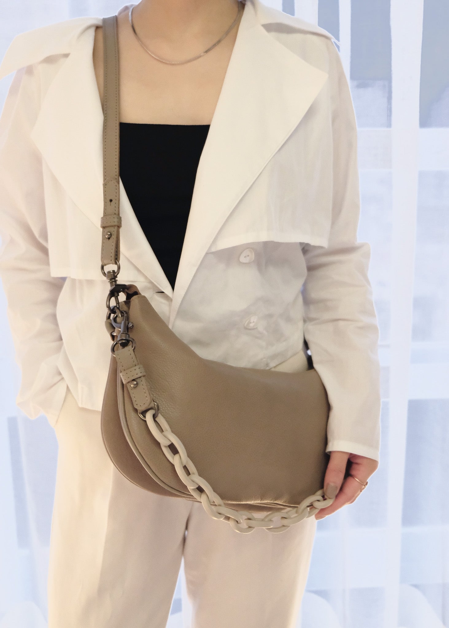 - Metal hardware details and plastic chain