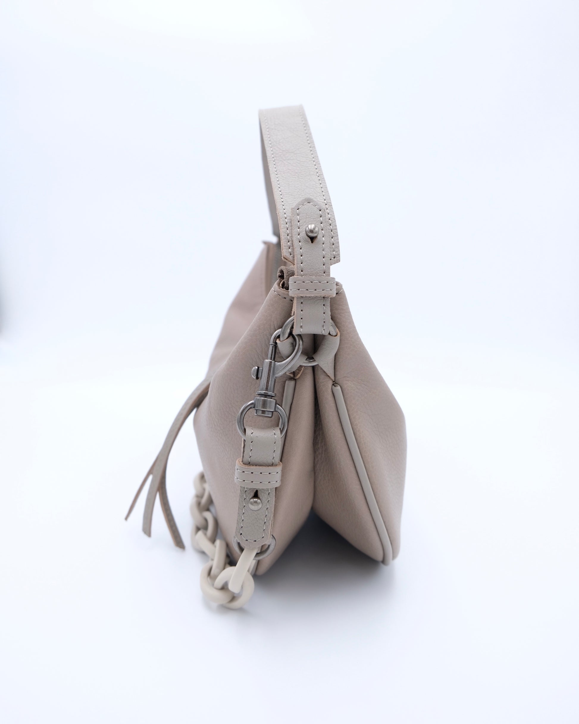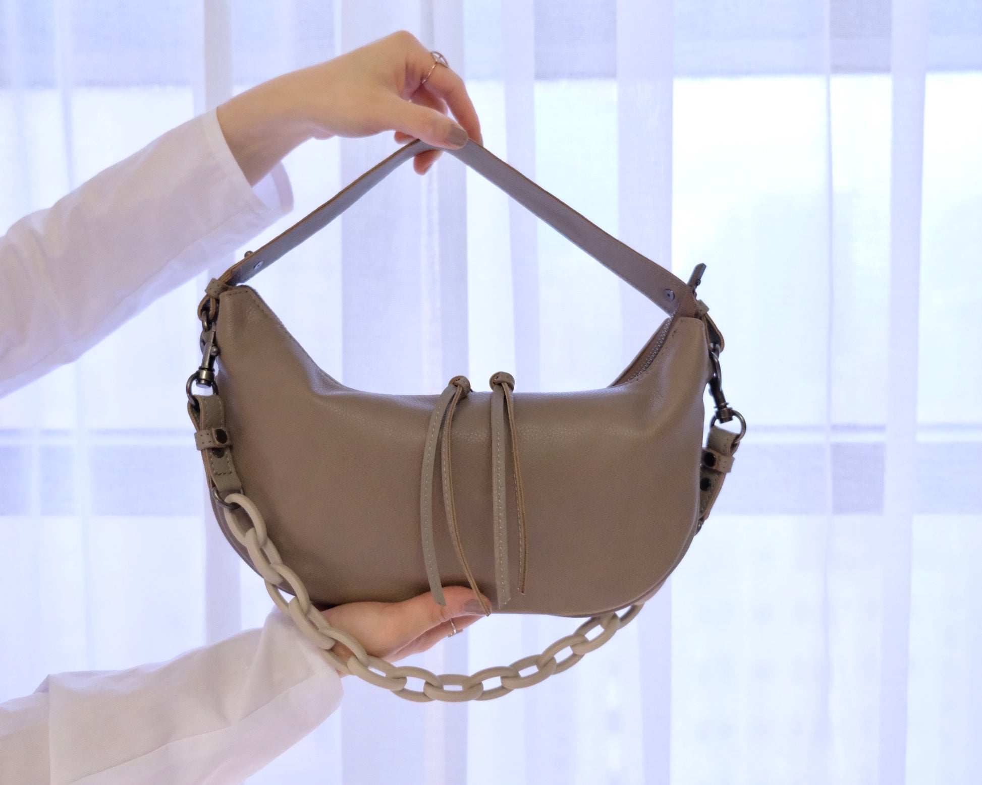 The two way leather bag in a cashew shape. To accessorise with a short chain, it is trendy and lovable. A detachable short strap and a long strap are provided. You can match Katy Cashew with various styles, or switch your day to night look without much effort.